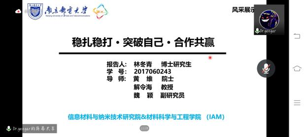 林冬青是2017级博士研究生,光电信息材料与器件专业,他曾以第一作者身份在《自然·通讯》《先进·材料》《研究》以及《有机·快报》等国际著名期刊发表论文4篇,另有其他参与发表的论文14篇。他以“稳扎稳打,突破自己,合作共赢”为主题,结合自身丰富的研究经历,从论文写作、文献阅读、论文答辩等方面与同学们分享了宝贵的科研经验。他鼓励同学们打好专业基础,在实践中不断磨练、开拓创新,努力成长为专业的科研人才。